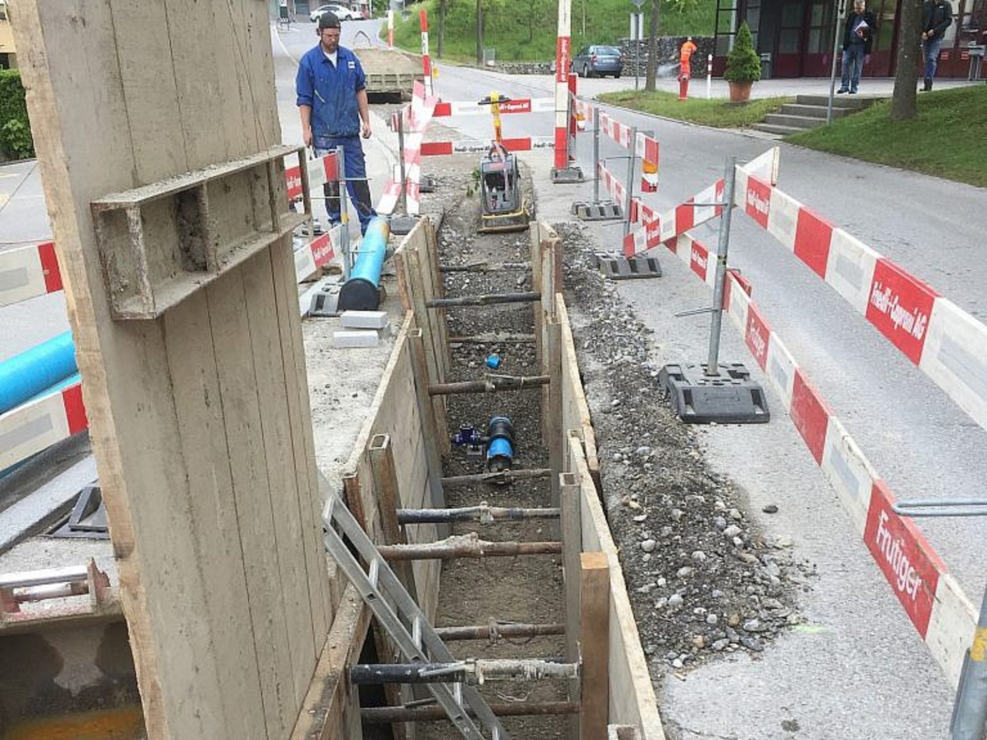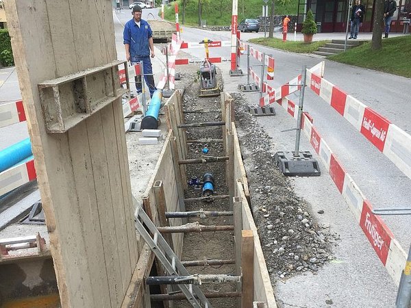 Die Hauptleitung wird im gespriessten Graben verlegt. Die Hausanschlussleitungen werden teils in die alten Gussleitungen eingezogen und nur mit punktuellen Gruben zusammengeschlossen.